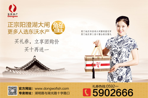 近日,东沃水产中秋系列广告在厦门各大写字楼、高档小区、公交车身、车库、电视台、报纸、网络全面铺开!随处可见“正宗阳澄湖大闸蟹,更多人选东沃水产”的响亮口号!