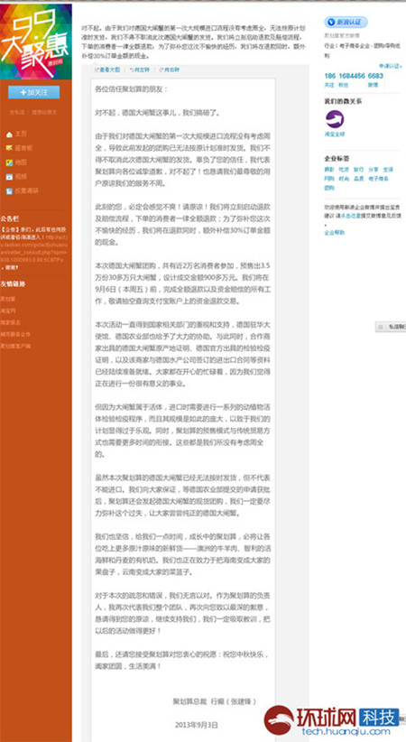 两年来,德国人居然看着大闸蟹成灾发愁,淘宝三天内就卖了30万只!”就在马云微博汇报完战绩的第二天,8月22日国家质检总局就布通告,称尚未收到德国官方正式申请,也未收到企业进口德国大闸蟹的检疫许可申请。昨天上午,聚划算的新浪官方微博宣布:将立刻启动退款及赔偿流程,下单的消费者一律全额退款,并额外补偿30%订单金额的现金。