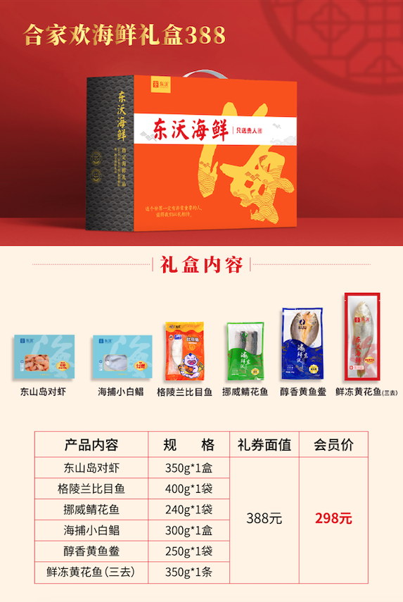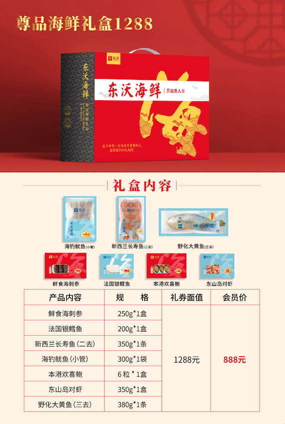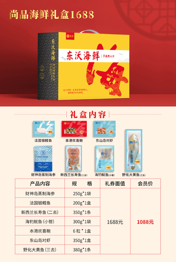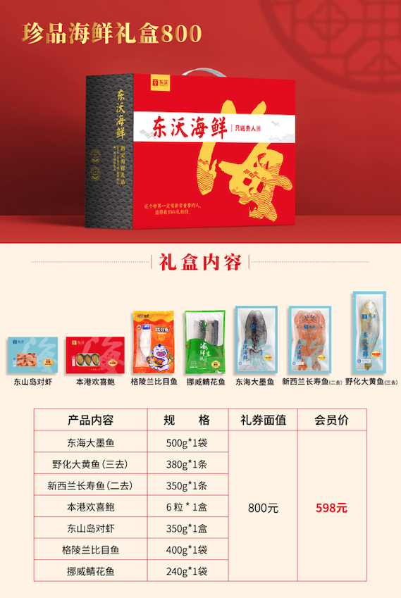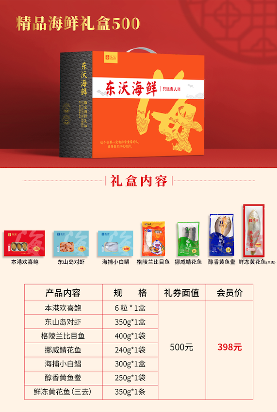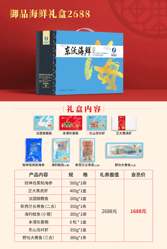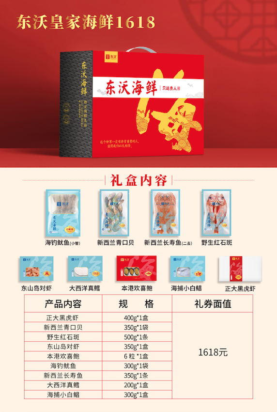 东沃海鲜盛宴礼盒经典款一共6款,价格从低到高,满足不同消费者的需求;定制款2款,为企业贵宾专属定制。